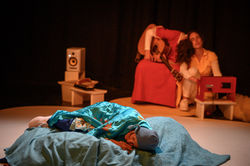Zwei Spielerinnen und ein Musiker probieren an und aus und um, entwerfen immer wieder neue Bilder, neue Situationen, erfinden Phantasiewesen, verspielen sich mit Witz und Poesie in Klamotten und Klängen.